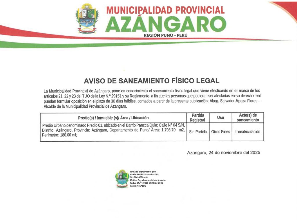 La Municipalidad Provincial de Azángaro, pone en conocimiento el saneamiento físico legal que vieneefectuando en el marco de los artículos 21, 22 y 23 del TUO de la Ley Nº 29151 y su Reglamento, a fin quelas personas que pudieran ser afectadas en su derecho real puedan formular oposición en el plazo de 30días hábiles, […]