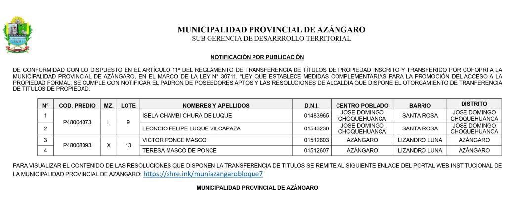 LA MUNICIPALIDAD PROVINCIAL DE AZÁNGARO REALIZA LA PUBLICACIÓN DE PADRON DE POSEEDORES APTOS PARA LA TRANSFERENCIA DE TITULOS DE PROPIEDAD INSCRITOS Y TRANSFERIDOS POR COFOPRI A LA MUNICIPALIDAD EN EL MARCO DE LA LEY 30711. DESCARGAR RESOLUCIONES