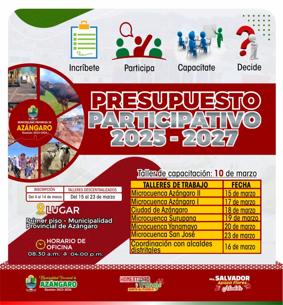 La Gerencia de Planeamiento y Presupuesto de la Municipalidad Provincial de Azángaro, invita a la población debidamente organizada a participar del proceso de Presupuesto Participativo Basado en Resultados con enfoque Multianual 2025-2027. Este se alinea con la visión de promover una gestión pública transparente, inclusiva y orientada a resultados, con la participación activa de la […]